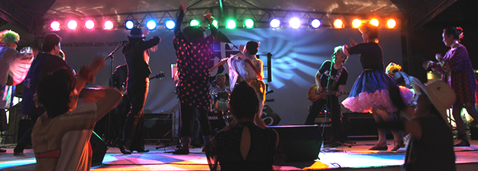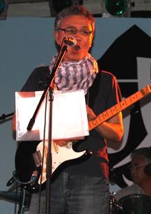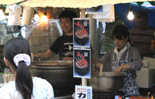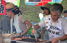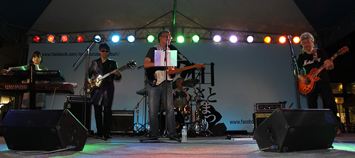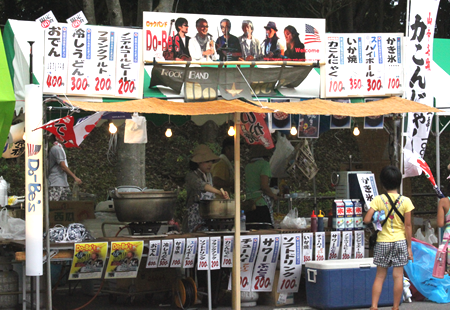 我がDo-Be'sはこのステージ出演を第一目標に定め日々練習に励んできましたので、この大イベントにDo-Be'sを起用して頂きましたことに深く感謝しております。 今年はバンド演奏に合わせて踊っていただく他の団体とのコラボや、大勢の方が知っているテレビドラマの主題歌や団塊の世代におなじみの「グループサウンズ・メドレー」等を演奏させていただき、これまで以上の盛り上がりで一夜の夏を過ごしていただけたものと観客のみなさんの笑顔を拝見して感じたところです。 特に曲「狂わせたいの」では40人の踊り子が舞台の上下に出現し突如踊り出す様子は圧巻そのもので演奏者はもちろんのこと見ている方がビックリしながらもハイテンション状態。今後もいろいろ工夫して皆さんに喜んでいただけるバンド活動をと思える一瞬でした。 また、3年目となるテナント出店にも参加させいただきました。 今年の出店場所はボンベルタバス停向かい側の絶好の場所を確保することができ、順調な滑り出し。出し物は店長の出身地である山形県から取り寄せた「玉こんにゃく」、恒例となりました7品目入りの「おでん」(昨年の半分の60食限定)、漁獲量の少なくなった「いか焼き」、3種類の「フランクフルト」、おでんを少なくした代わりに出品した「冷やしうどん」、「かき氷」、「ソフトドリンク」等々盛り沢山の出品でしたが、好天気のためか初日はすべて完売となりました。特に昨年と違うのは「かき氷」が予想以上に売れたことにビックリ。 次の日は早朝から雨模様。 開店の準備をしていた午前9時頃には本降り。空を見上げるも到底止む気配がみられない。絶望的になりながらもブルーシート等を駆使してし準備が整った10時ころには雨が弱まりなんとか開店することができました。 このような感じで2日間が過ぎましたが、主たるメンバーは還暦を過ぎており準備・販売・後片付け等で肉体的にはクタクタ状態。幸いにもファミリーの協力により連帯感、達成感が相まって精神的には快い疲労感で、また来年も出店しているかも 。 |