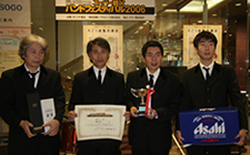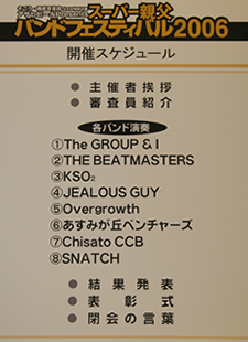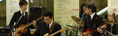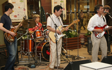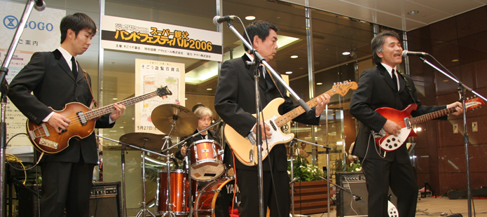 千葉そごうで「スーパー親父バンドフェスティバル」が開催され、テープ審査を通過した8組が参加しました。ビートルズの来日40周年ということで、課題曲がビートルズであったためKSO2もビートルズの「Slow Down」等数曲演じました。全国18店舗で開催されたフェスで各地区の優勝バンドはビートルズが来日した祭に記者会見したキャピトル東急の真珠の間で開催されるBAND LIFE 2006への出場権が得られるということでKSO2としては初めてのコンテストでしたが、優勝を意識しなかったためか、気負いもせず普段着の演奏に努めたところラッキーにも親父度No.1と称され審査員全員の推薦により優勝することができました。詳細につきましては「SPECIAL REPORT」のページに掲載中です。